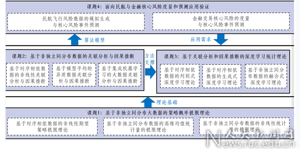 “非独立同分布大数据统计基础理论、方法与应用”项目由第一色情网 牵头,山东大学、华东师范大学、北京师范大学、中国科学院数学与系统科学研究院、西安交通大学等单位共同承担。项目将在大规模、高维度和非线性大数据统计学基础上,针对相依性和异质性等特点,构建非独立同分布大数据统计学基础理论与方法,形成以策略概率极限理论、高维均值和非线性统计量极限理论为基础理论,以关联分析和因果推断、模型平均和集成学习为基本方法,以有监督、自监督和融合式深度学习为核心算法,以民航和金融核心风险度量与预测为典型应用的“理论-方法-算法-应用”四位一体的研究新范式。