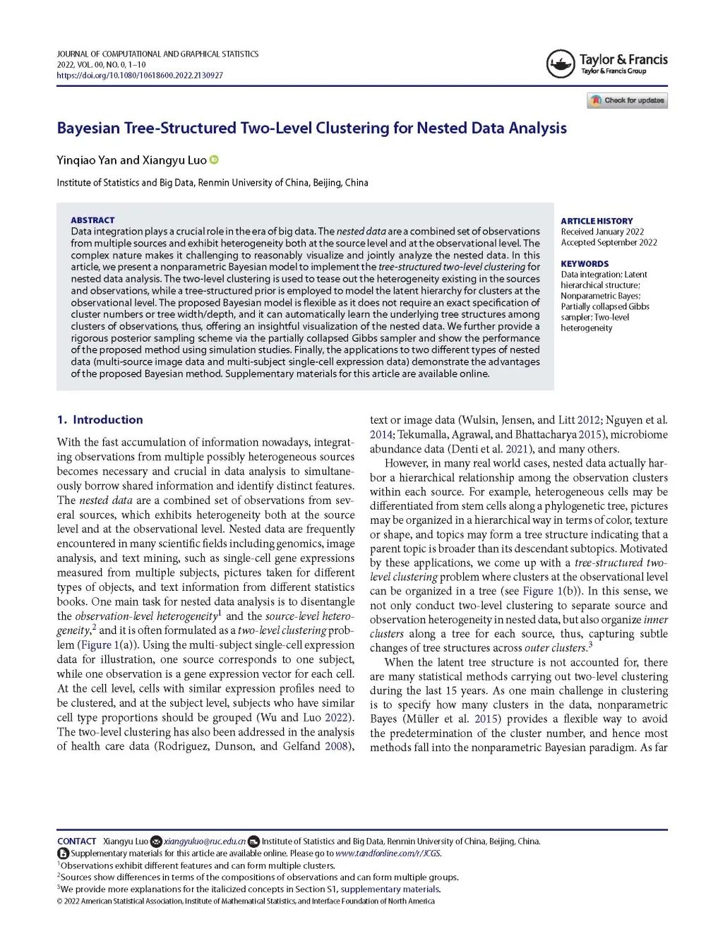 2022年9月20日,我院博士研究生闫引桥与导师罗翔宇副教授合作的论文“Bayesian Tree-Structured Two-Level Clustering for Nested Data Analysis”被统计学期刊《Journal of Computational and Graphical Statistics》接收。
